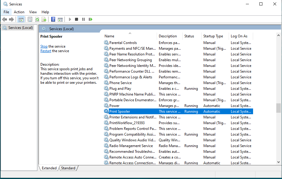 - Click on the spooler, then right-click on that, and then “restart” it.